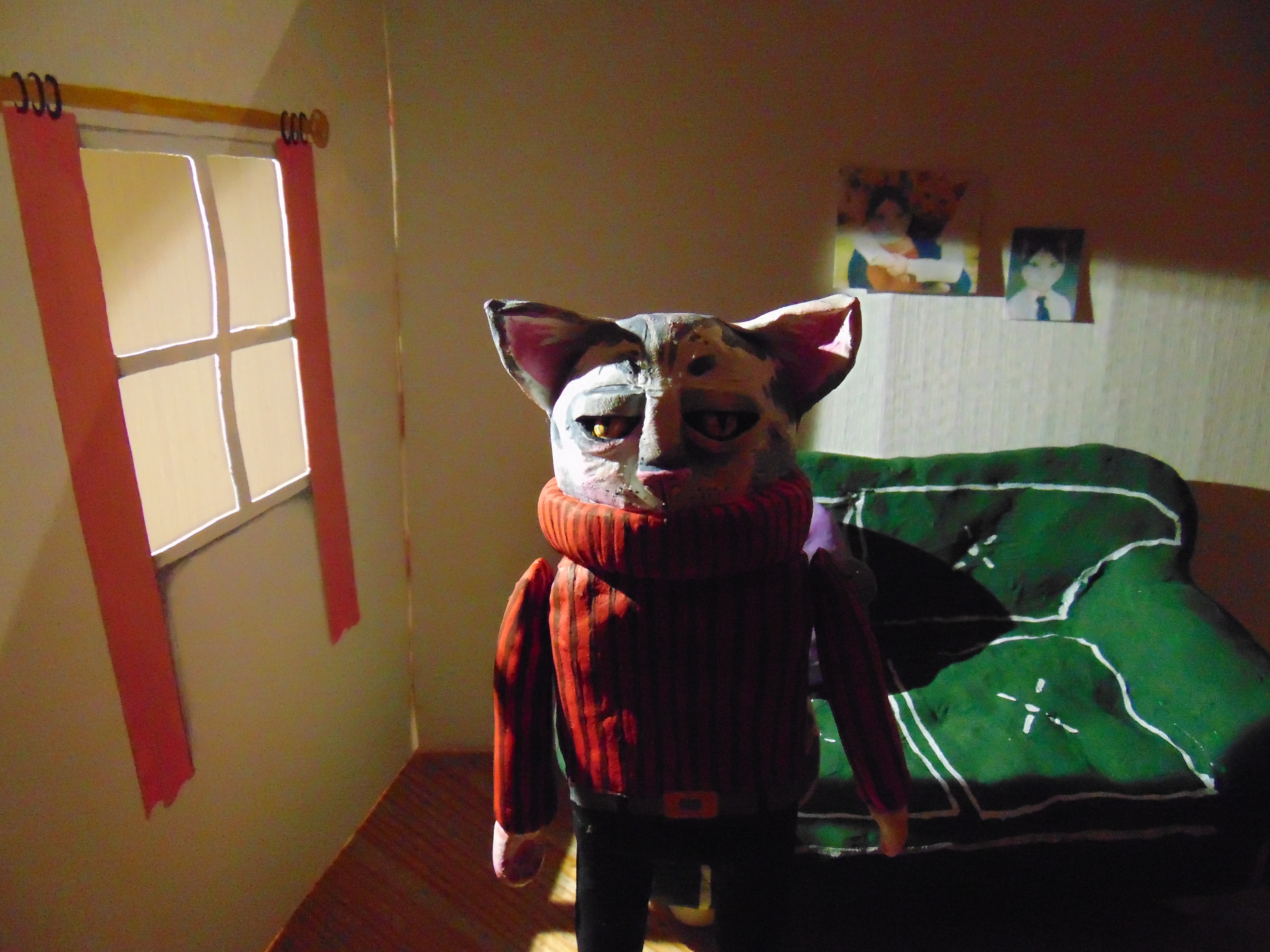 For this project I created a double page spread depicting an anthropomorphised character experiencing a difficult time in his life. The Cat Man aims to display the emotions of being locked inside all alone during the covid 19 pandemic. Model made using 1mm wire and ploymer clay, then painted with gouache.